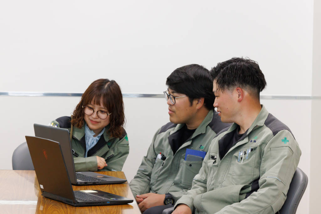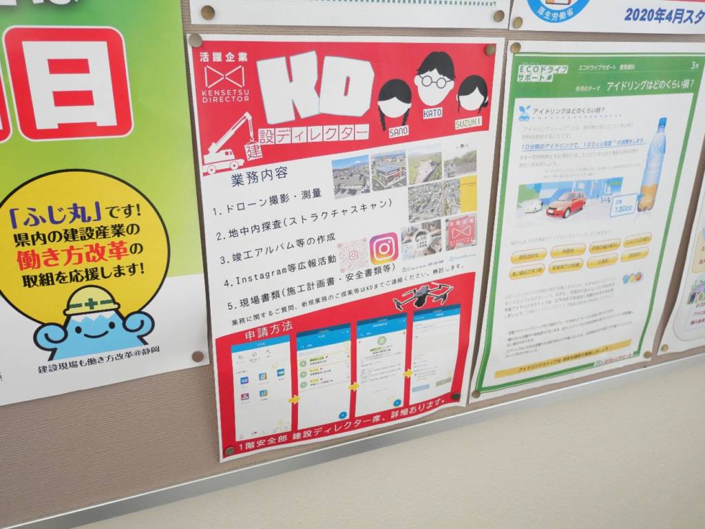 営業・土木・建築・総務・安全から代表が集まり、業務のデジタル化を進めています。例えば、毎月同じ作業をネット提出に変えるなど効率化を実現しました。広報活動ではインスタ広告や営業用チラシをデザインしました。デジタルブック化してQRコードから閲覧できるようにしたり、色彩の知識を活かして制作を担当しました。