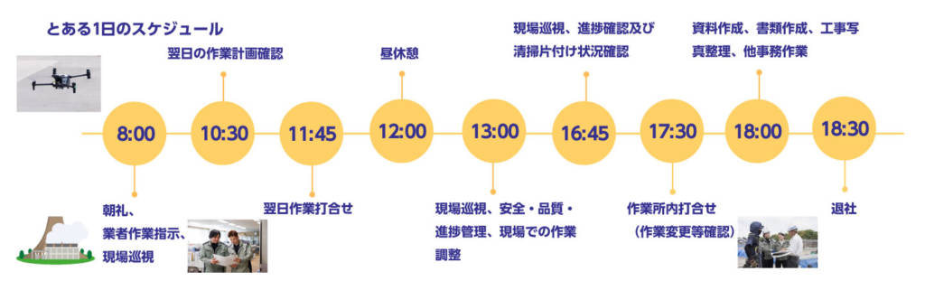 土木施工管理は、橋梁、道路、鉄道、ダムなどの土木工事において、現場での施工(せこう)計画を立 案し、工事の監督・指導を行う。施工計画をもとに、実際の現場で施工管理、安全管理、品質管理、工 程管理など、工事の監理を行う。工事の全体の流れを把握して、作業責任者に適切な指示を与えること が必要である。使用する資材、機械の手配や管理も行う。